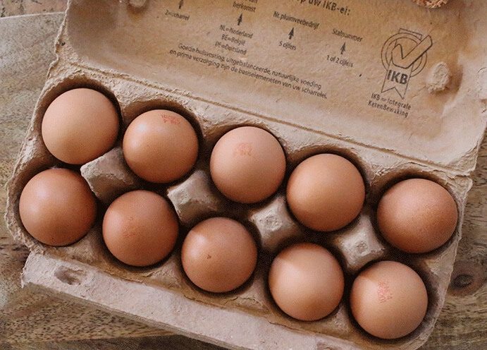 Verse scharreleieren, tien stuks in een doosje.