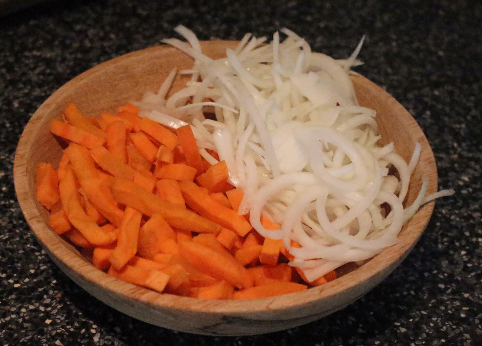 Vers gesneden hutspot; 500 gram uien en 500 gram winterpeen.